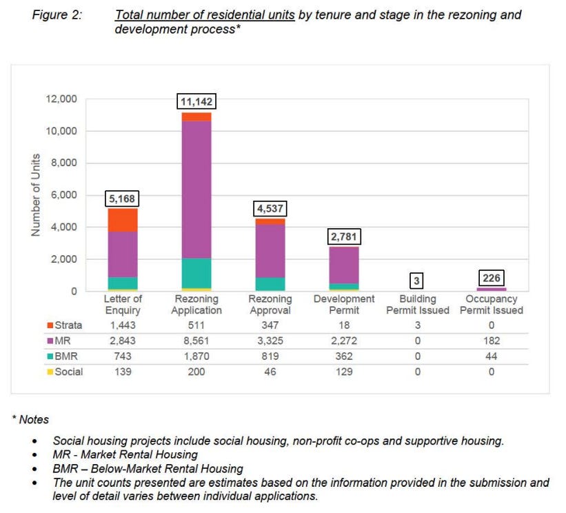 There’s a strong incentive to try to get your rezoning approved as soon as possible, even if you’re not intending to build right away, because Vancouver only allows two high-rises per block face. So the key question is, which projects have proceeded to applying for a development permit? Right now there’s a total of a bit less than 2,800 apartments at that stage, mostly rental apartments.