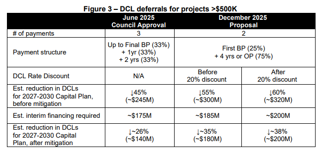 Allowing 75% of the DCL payments to be deferred would have a more sizable impact. There was a June 2025 council decision allowing two-thirds of the payments to be deferred, which would have an impact of $140M (looking at the funding available for the current capital plan). With the proposed changes, the impact increases to $200M. The incremental change is $60M, or about 2.5%; the total impact is $200M, or about 8.3%.