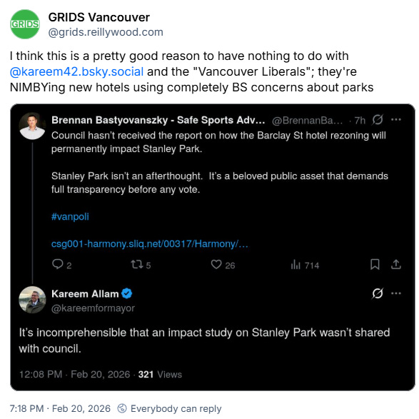 Kareem Allam and the Vancouver Liberals - like the old BC Liberals, they’re not affiliated with the federal Liberals - claim that they’re the most pro-housing party in the race. But as Reilly Wood points out, they’re opposed to the Barclay hotel.